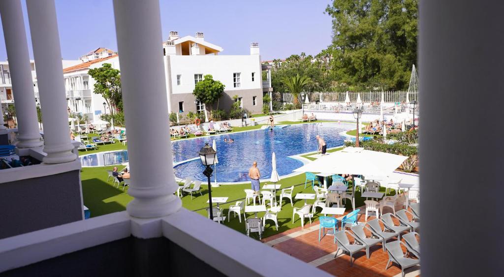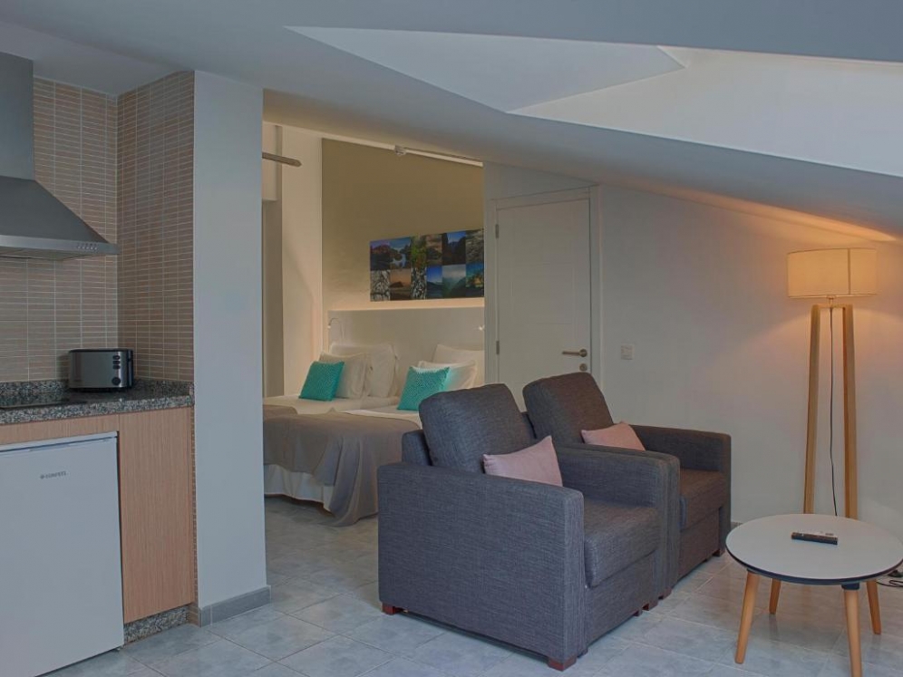 The delightful apartment complex enjoys a prime setting in Playa de Las Americas, on the exciting island of Tenerife. The complex is situated just 800 metres from Playa de las Vistas Beach, and within easy access of the main attractions that the area has to offer. Set amidst the grounds of the Las Americas golf course, the charming complex is the perfect choice for sports enthusiasts and those who enjoy a leisurely game on the green. The delightful complex enjoys a contemporary style, with a bright exterior evoking a sense of serenity and tranquillity. The apartments are beautifully appointed, and come complete with modern amenities for added comfort and convenience. The apartments offer a relaxing home away from home in which to completely unwind. The complex affords guests a number of excellent facilities, catering to the needs of every type of traveller.|Loft rooms are situated on the second floor of the building without any other access to it than by staircase. They are skylight rooms with a distribution similar to studios. No balcony nor terrace are available for this type of rooms.