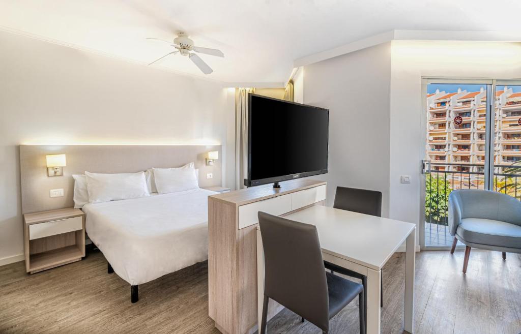 This modern apartment hotel enjoys a prime setting in the tourist resort of Los Cristianos. The complex is located just a few steps away from a host of shops, bars and restaurants. Guests will find themselves just 500 metres away from the beach. This wonderful complex greets guests with the promise of a relaxing home away from home. The apartments are beautifully designed, and come complete with modern amenities for added comfort and convenience. This hotel offers a seemingly boundless array of exemplary facilities, meeting the needs of every type of traveller. Guests can enjoy a leisurely swim in the pool, relax and unwind on the sun terrace, dine in style in the restaurant, and partake in a host of activities.